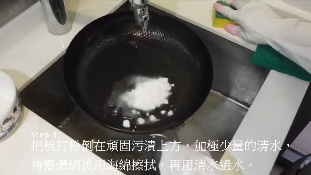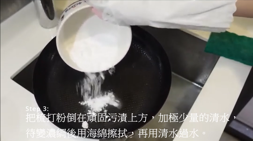 第三步:如有頑固污漬,在其上方倒入梳打粉,加入極少量清水使其固化變稠後用海綿擦拭,再用清水過水。