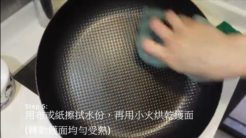 第五步:以布或紙擦拭水份,再用小火烘乾鑊面,並不時轉動鑊身使其均勻受熱。